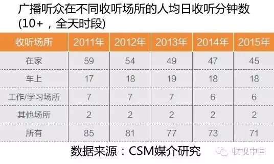 2015年人均日收听分钟数为71分钟,较2014年的73分钟减少2分钟。家中收听分钟数从2014年的47分钟,降低到2015年的45分钟。2015年车上收听量与2014年基本一致,为18分钟。