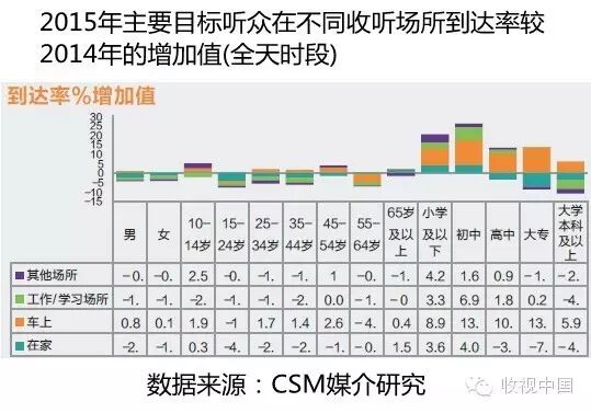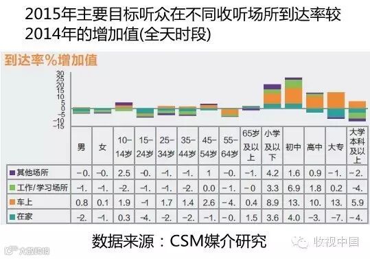分场所广播收听到达率对比值数据更为明显地说明了这一情况。从2014年至2015年两年的同比数据来看,绝大多数目标听众在家中、工作/学习场所和其他场所的到达率均有所降低。