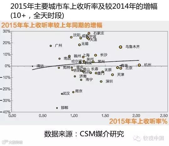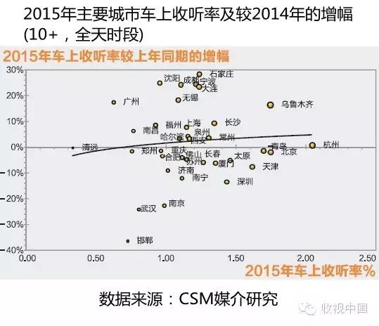而在另外一些车上收听率低于平均值的城市,如上海、泉州、西安、沈阳、哈尔滨、福州、南昌和广州的车上收听率也较2014年有所增加。