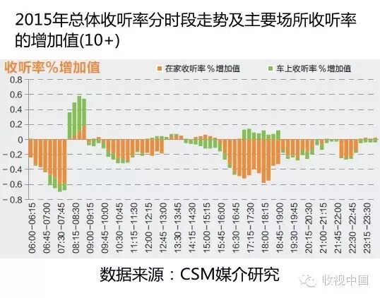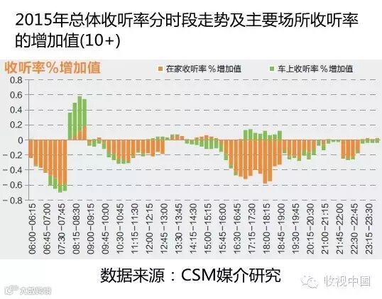 车上收听率则在早间08:00-09:00、12:00-14:00和16:45-19:00三个时段出现提升,车上收听率的增长已不再广泛地分布于全天时段,而仅仅发生于早晚上下班和午间休息的交通高峰时段。