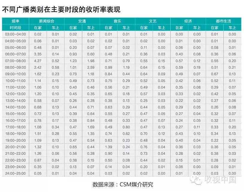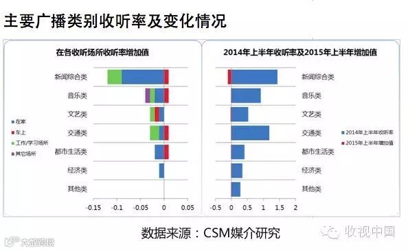 分析收听率发生下降的结构发现,主要广播类别频率收听率的降低主要发生于在家中,尤以新闻综合类频率最为明显,而音乐类、都市生活类、交通类和新闻综合类频率的车上收听率还有所提升。