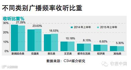 今年上半年,领先的新闻综合类频率收听比重较2014年同期降低,而交通和音乐类广播频率收听比重较2014年同期轻微提升。