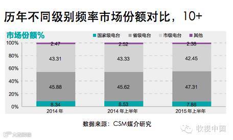 2015年上半年汇总数据显示,国家级电台市场份额为7.86%,省级电台市场份额为47.31%,市级电台市场份额为42.45%。