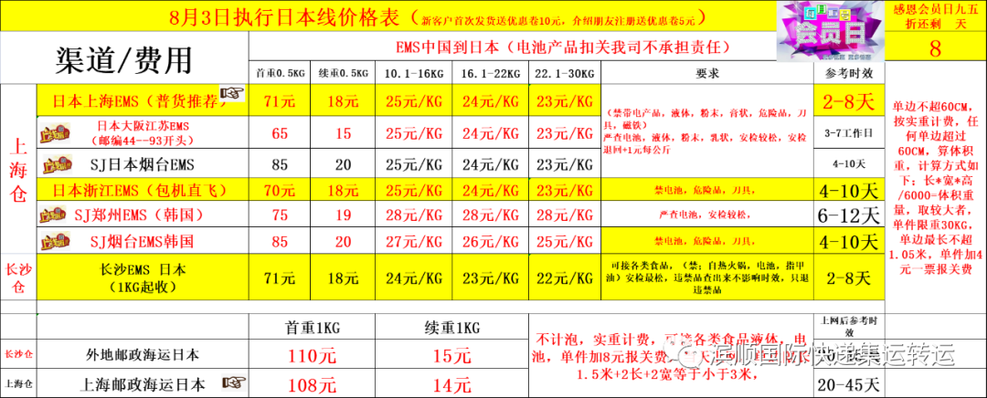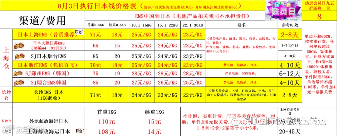 日本EMS新增渠道如下,海运价格表,
