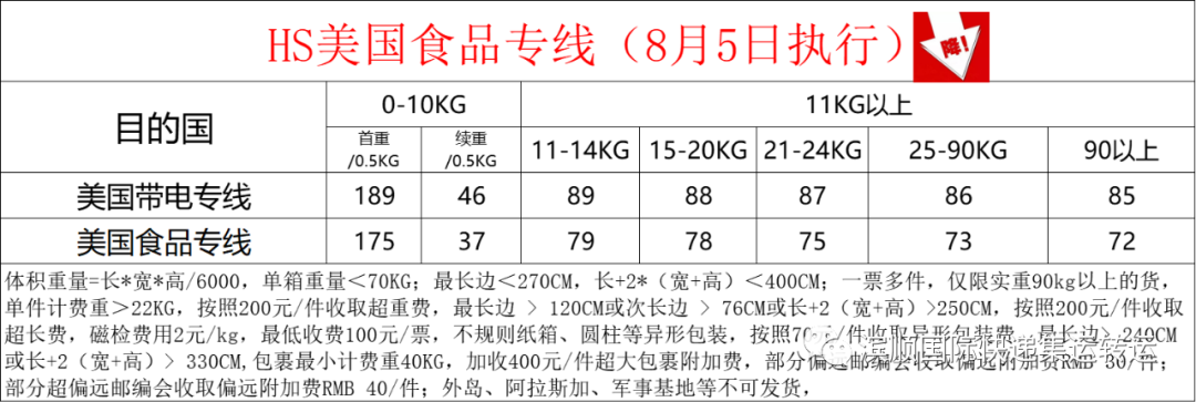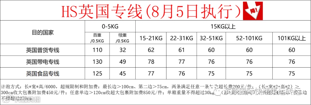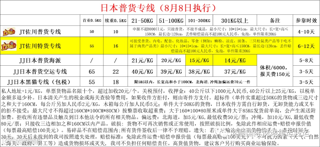 日本专线新增价格表如下;