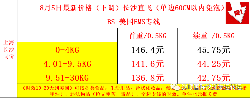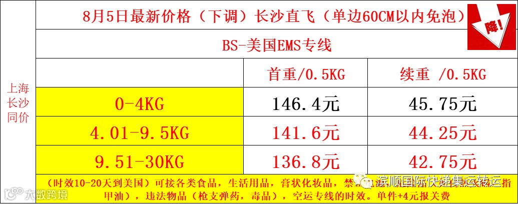 美国EMS专线,60CM以内免泡,降价价格表如下;
