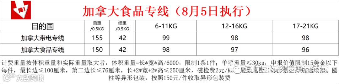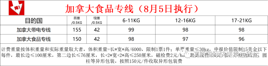 加拿大空运专线,降价价格表如下;