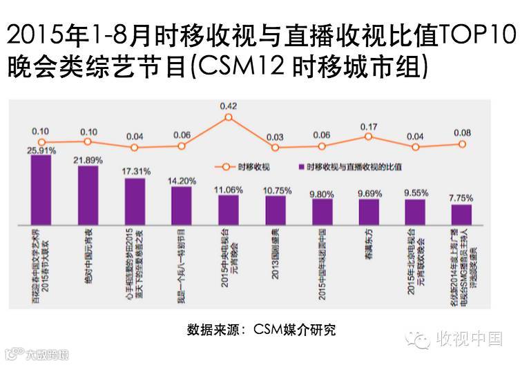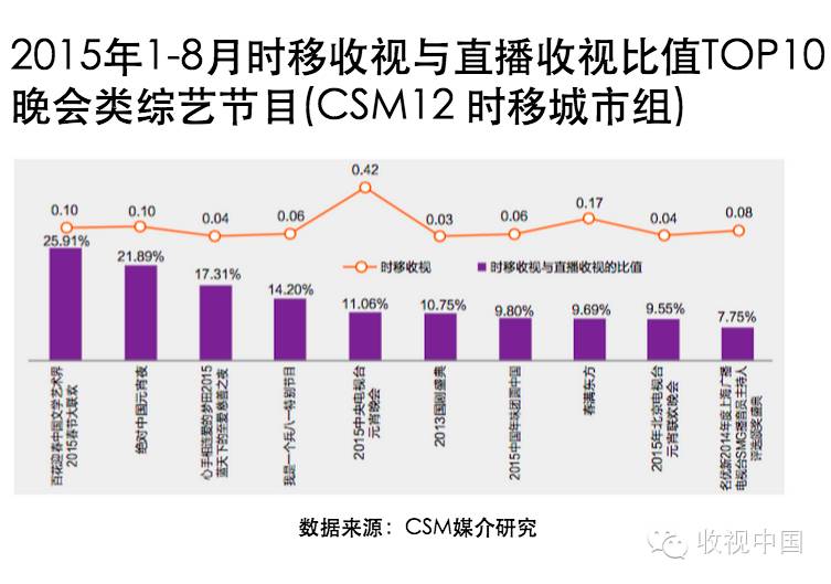 时移收视与直播收视的比值最高的十档晚会类节目中,上海东方卫视播出的《百花迎春中国文学艺术界2015春节大联欢》时移收视对直播收视的提升幅度最大,达到25.91%。