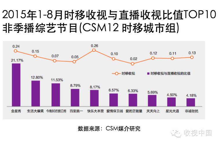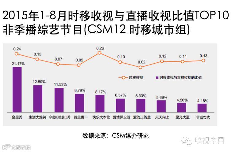 时移收视与直播收视的比值最高的十档非季播综艺节目中,上海东方卫视播出的《金星秀》时移收视对直播收视的提升幅度最高,达到21.17%,时移收视率为0.24%。