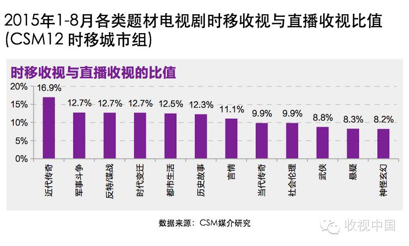 近代传奇、军事斗争和反特/谍战这三类电视剧是观众时移收视最多的电视剧。