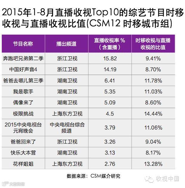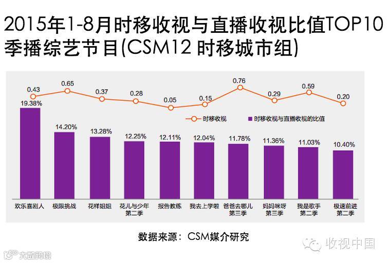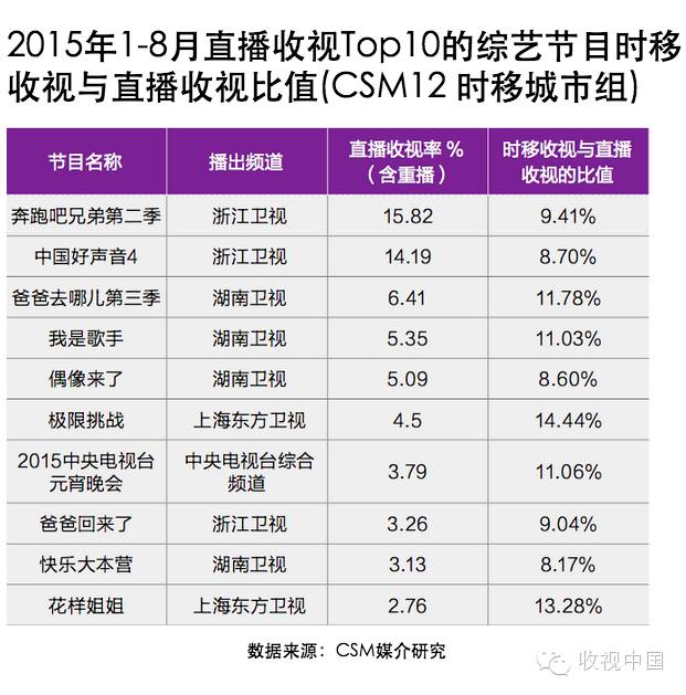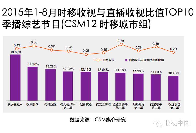 在所有时移收视与直播收视比值超过5%的综艺节目中,直播收视最高的前十档节目除中央台综合频道播出的晚会类综艺节目《2015年中央电视台元宵晚会》和湖南卫视播出的《快乐大本营》外,余下八个节目都是季播综艺节目,时移收视对这些热播的季播综艺节目的直播收视的提升幅度十分显著。