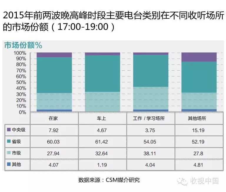 反观省级和市级频率,二者在不同场所的占比都相对均衡,晚高峰时段“车上”收听更显优势,市场份额分别为61.42%和32.64%。