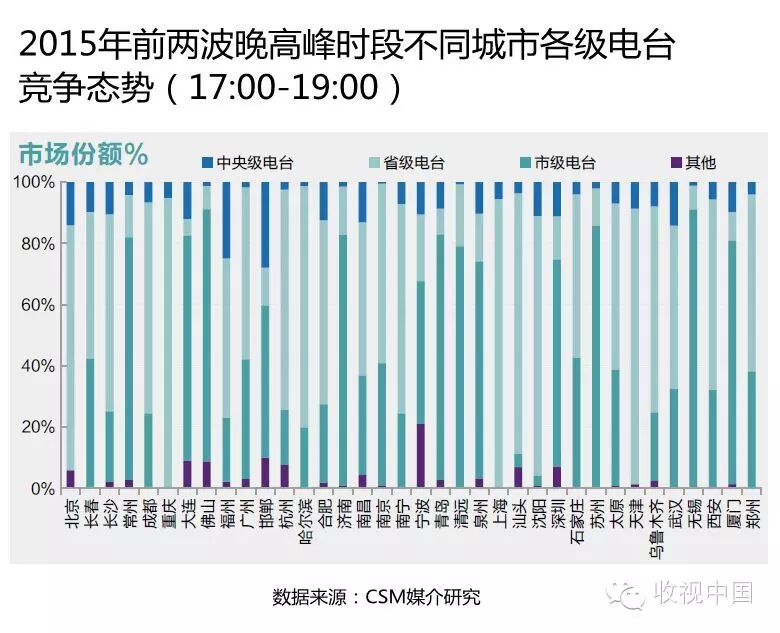 该类电台所占份额均在50%以上,重庆、上海、天津、沈阳和北京5个城市省级电台的市场份额超过80%。