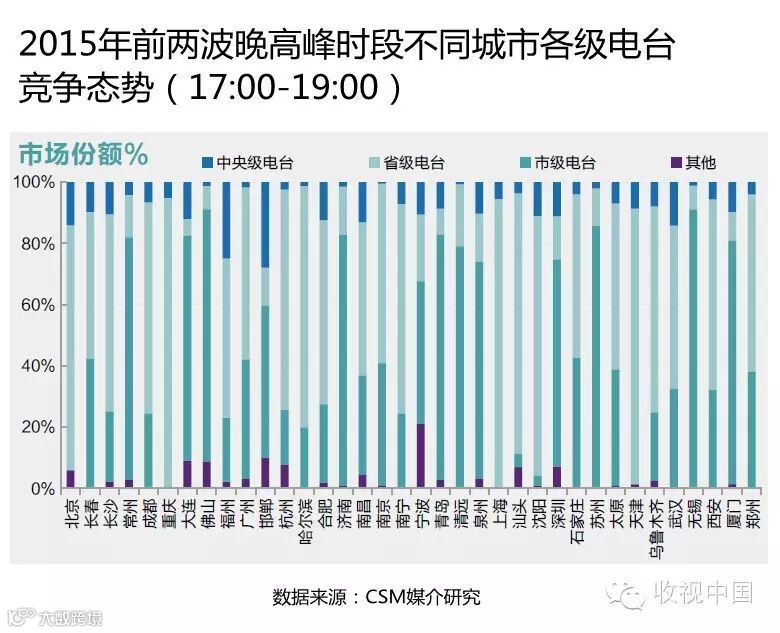 而市级电台则在常州、大连、佛山、济南、青岛、清远、泉州、深圳、苏州、无锡、厦门和汕头12个城市所占的市场份额超过50%,其中11个城市所占的市场份额更是超过70%;中央级广播电台则仅在福州和邯郸两个城市获得了超过20%的市场份额。