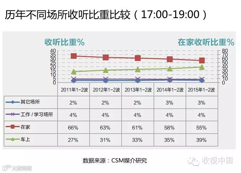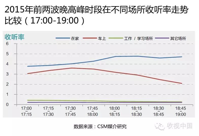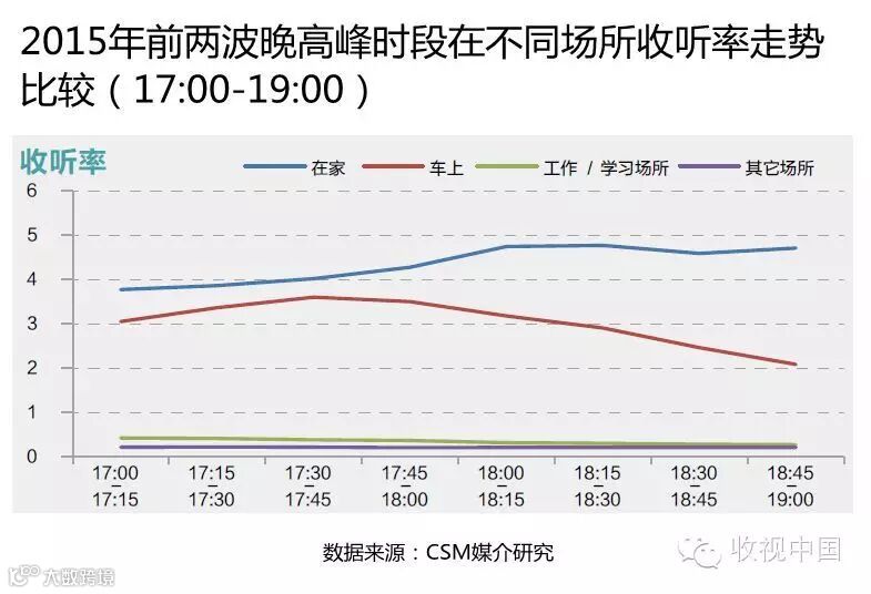 尽管当前晚高峰时段在家收听的比重依然最高,但下滑之势却难以逆转。