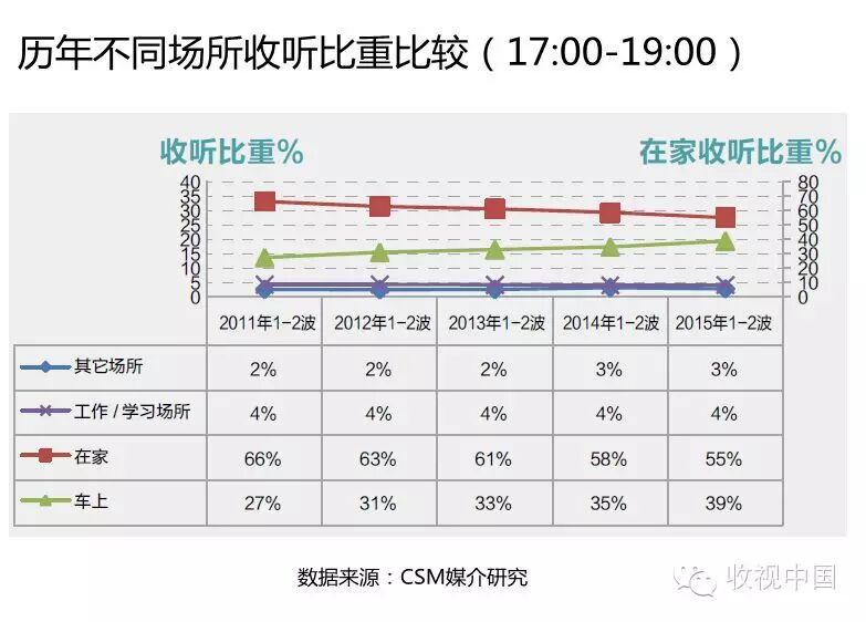 车上收听比重则节节攀升,从2011年的27%增加到2015年的39%。