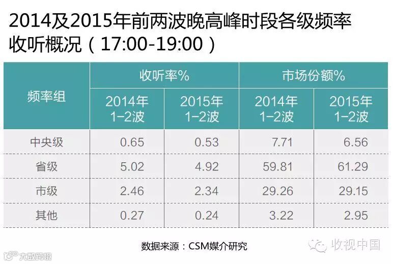 2014年前两波和2015年前两波晚高峰时段各级频率组所占市场份额此消彼长,占比趋同,省市两级频率所占市场份额之和占9成左右,其中省级频率份额约为市级频率的一倍,竞争力首屈一指。