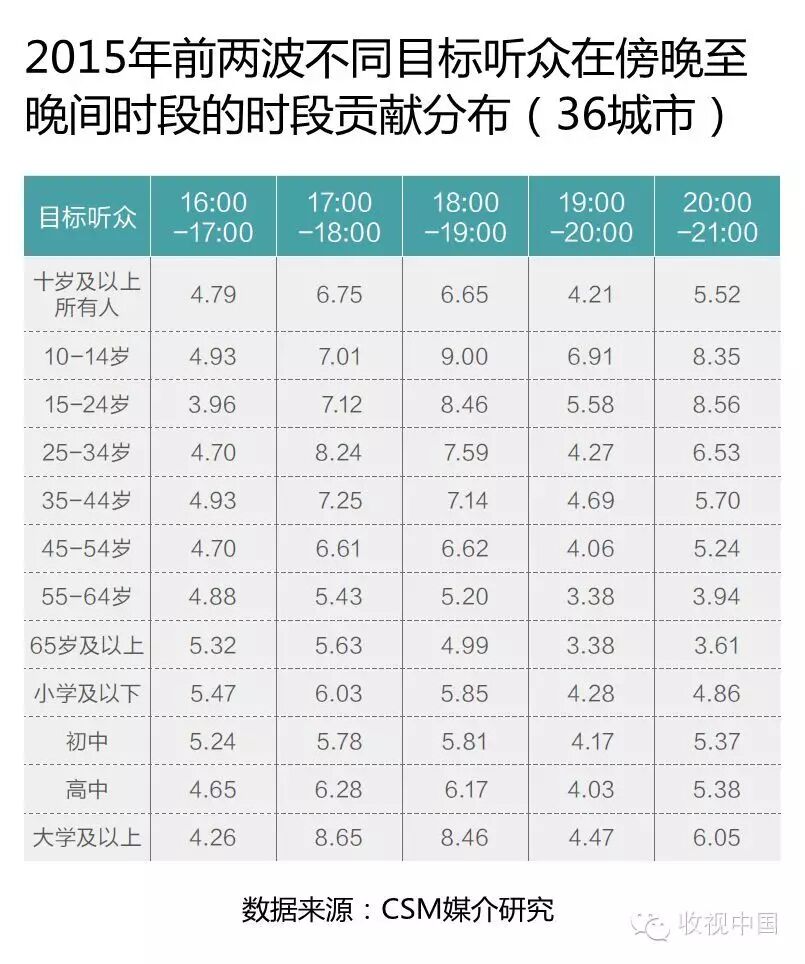 收听率高峰出现时间最晚的听众是15-24岁听众,收听高峰出现在20:00-21:00时段,该类听众可能是夜间娱乐和谈话互动类节目的重要听众。