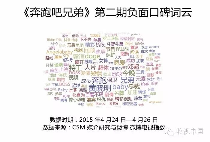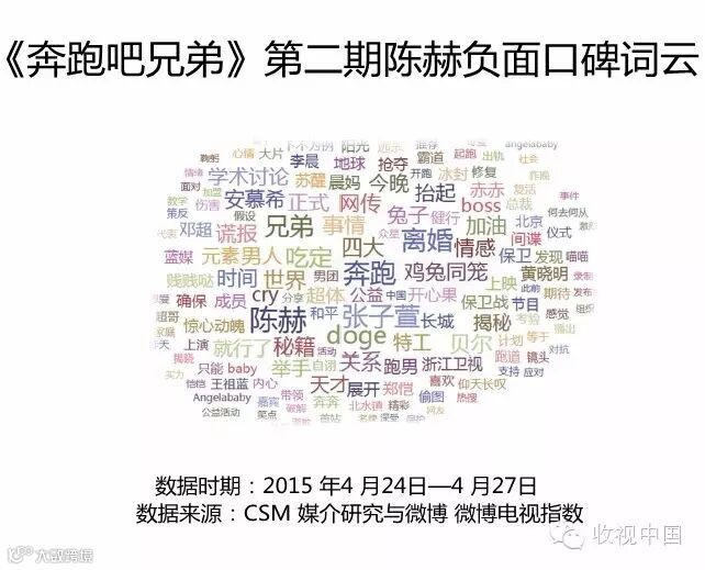 为更好地了解观众的想法,针对正面口碑比例最低且负面比例较高的第二期节目进行了分词分析。第二期中负面微博讨论的分词结果显示,陈赫和黄晓明的提及频次较高。