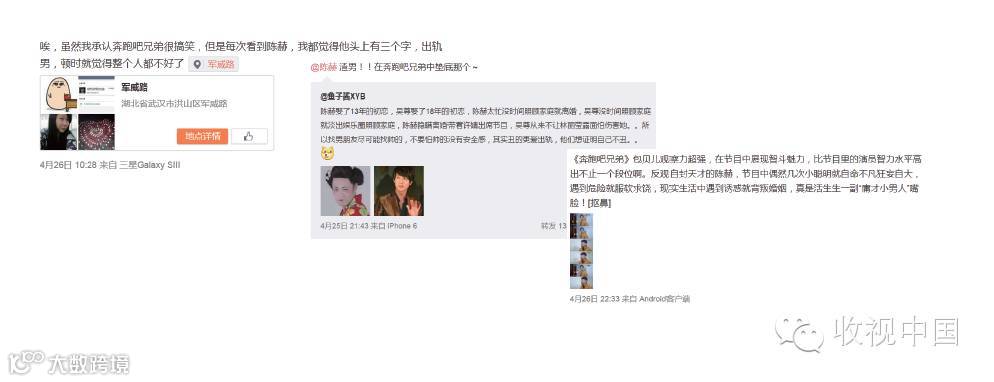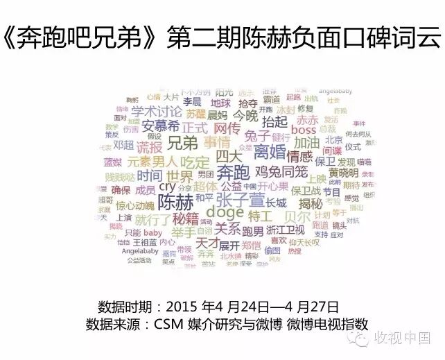 针对陈赫以及其离婚事件的相关博文分析后,观众对该事件的观点主要为“节目虽然好看,但是看到陈赫时总想到‘出轨男’”、“陈赫是渣男”、“因为陈赫背叛婚姻的行为,再也不想看跑男了”等等。