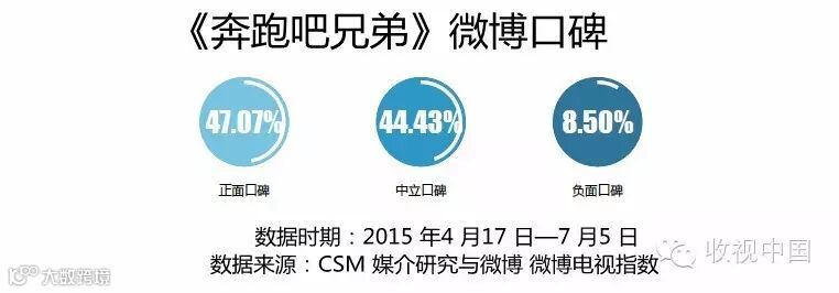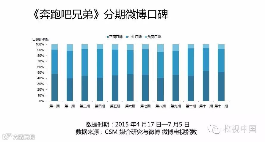 当然,随着播出,节目以其优良的制作让观众打消了疑虑。而在对第二季节目的微博口碑分析中发现,节目全季的正面口碑比例达到47.07%,中立口碑比例为44.43%,负面口碑比例仅为8.50%。