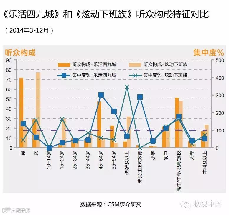 而《炫动下班族》的主体受众群则为女性、15-24岁和65岁及以上、初高中和本科及以上学历,从年龄段上来看呈现出两头大,中间小的态势。