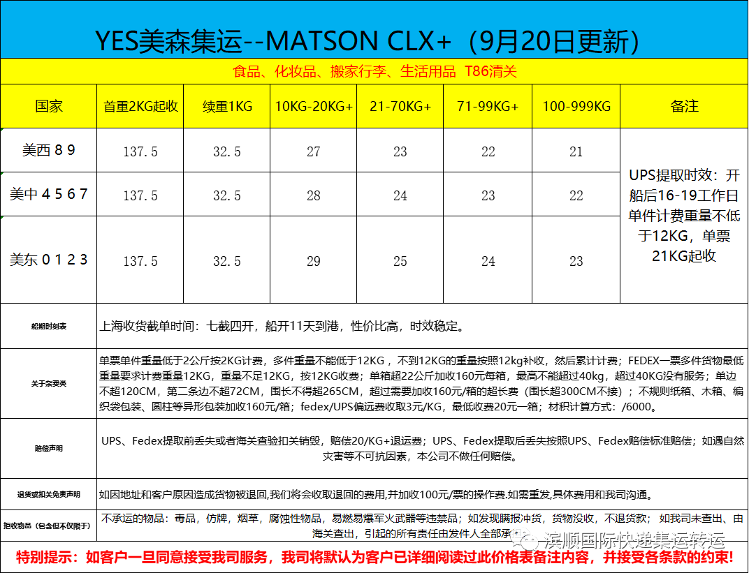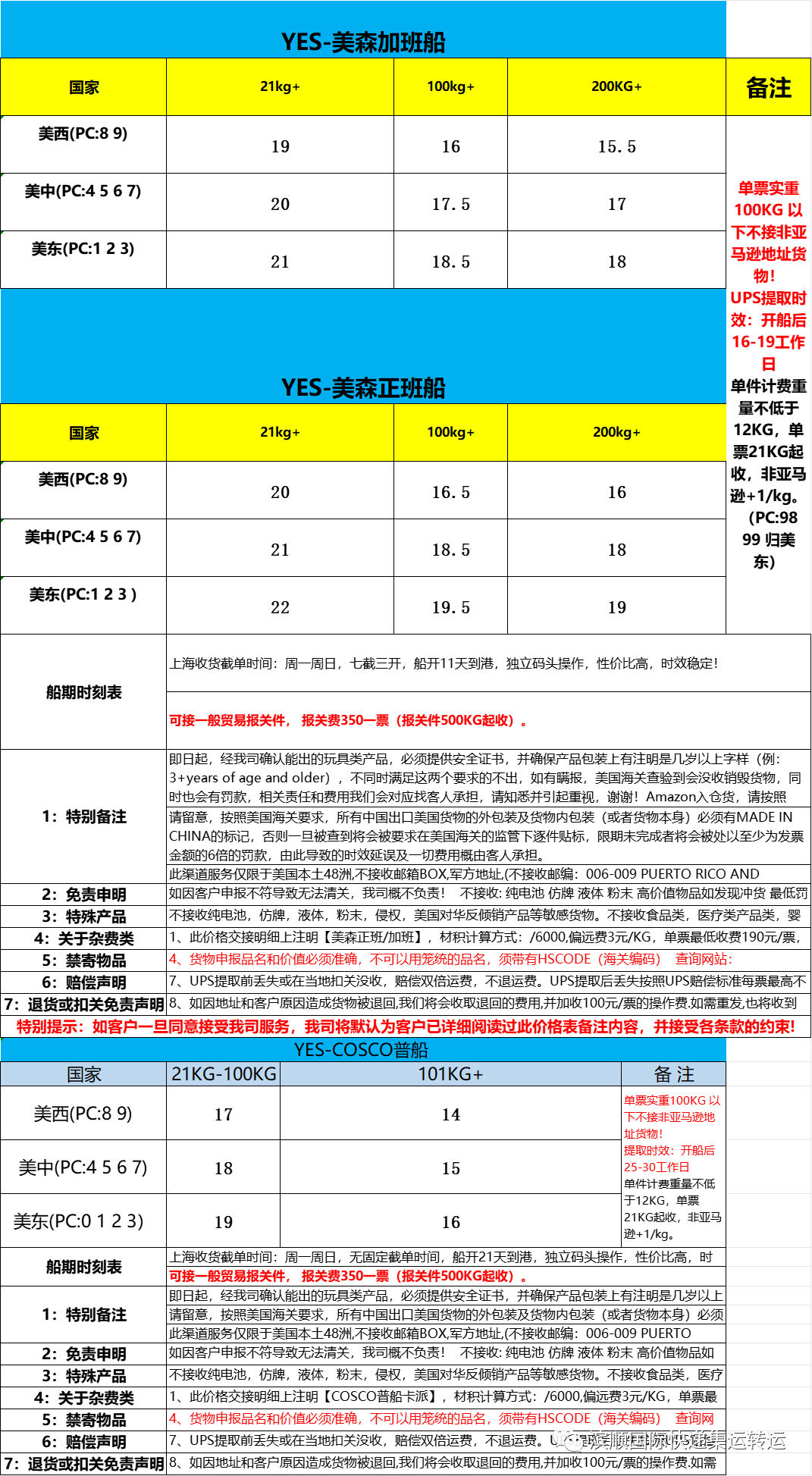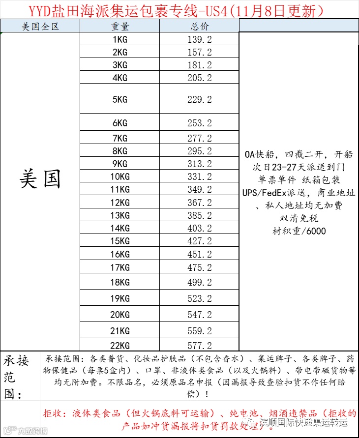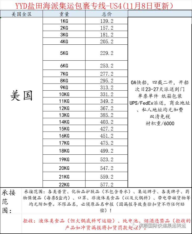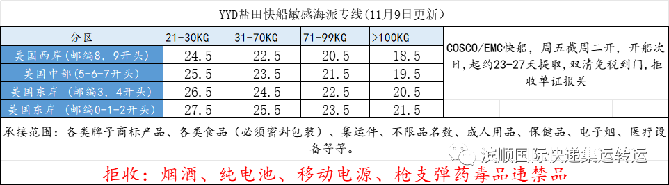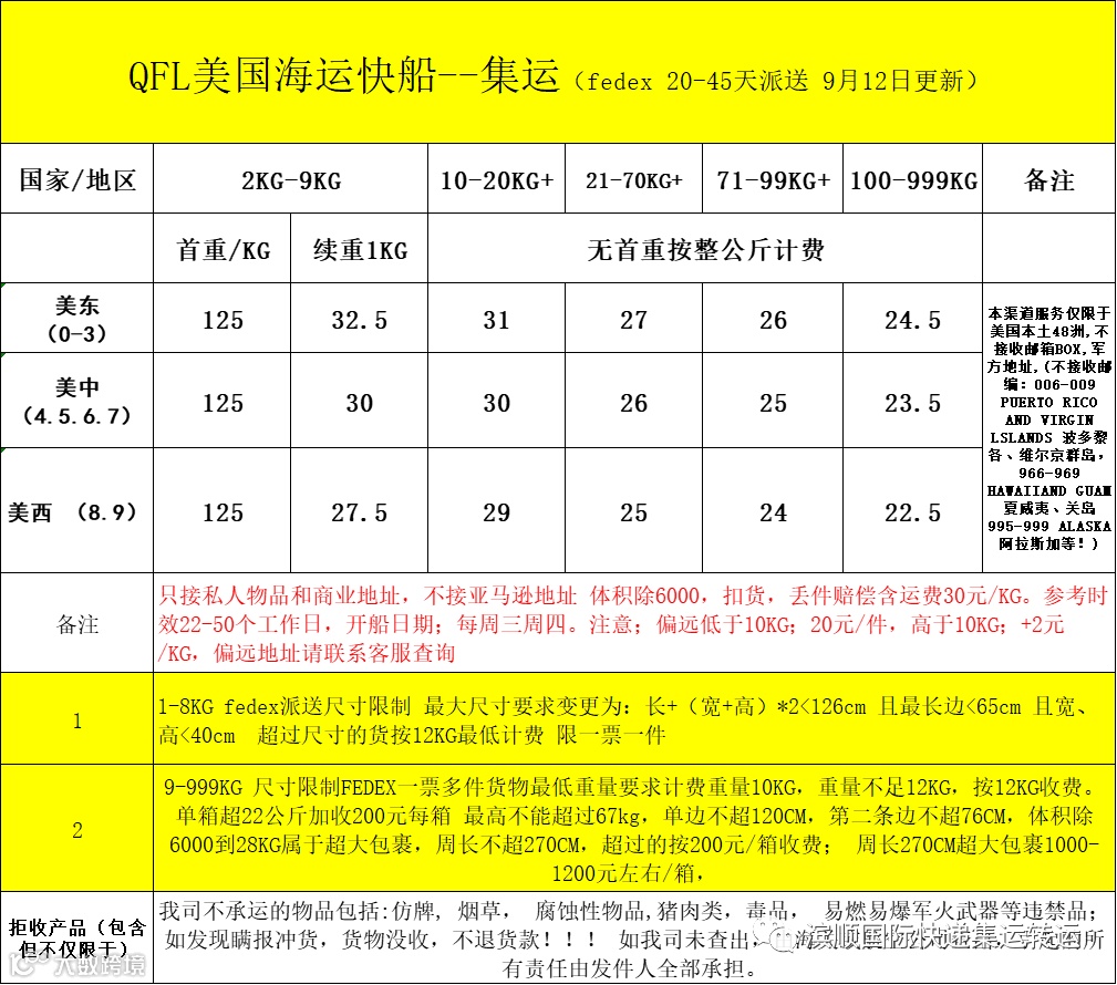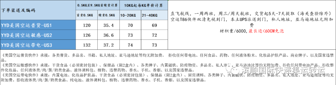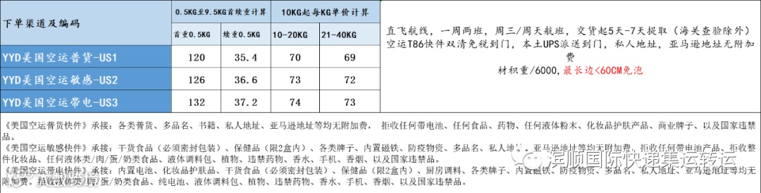 1.美国普货,敏感货,带电空运:价格下调,肉食品,仿牌等下图备注不能发的物品,请另咨询客服,优点单边60CM以内不计算体积,跟EMS计算方式一样,泡货非常划算,参考时效一到二周左右,双清关包税。