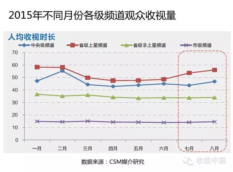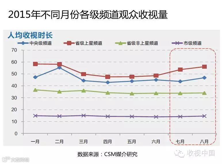 省级上星频道在包含了寒假和春节假期的1、2月的收视量处于全年较高的水平,在7至8月的暑期,观众的收视量较常态也有明显增长。