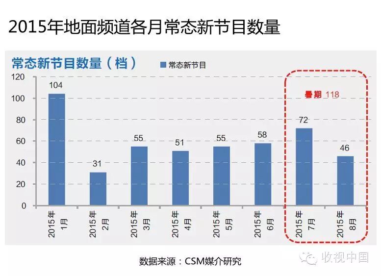 地面频道不断尝试适合于自身定位和市场需求的节目,在暑期的节目创新量猛增。2015年1月至8月,地面频道共推出472档常态新节目,除了开年的1月外,暑期是第二大新节目投放的集中区域,占了总体数量的四分之一。