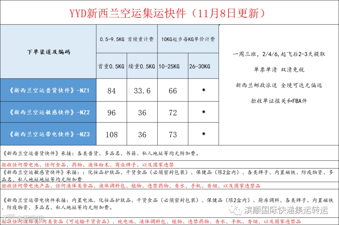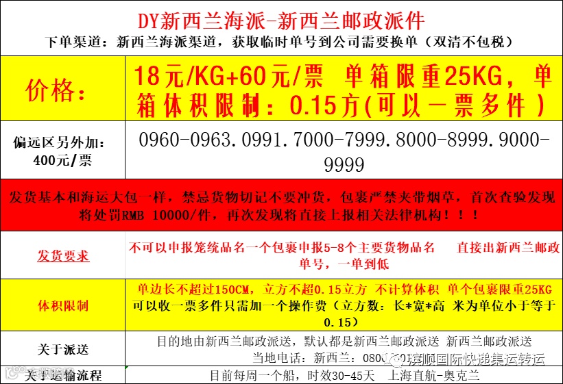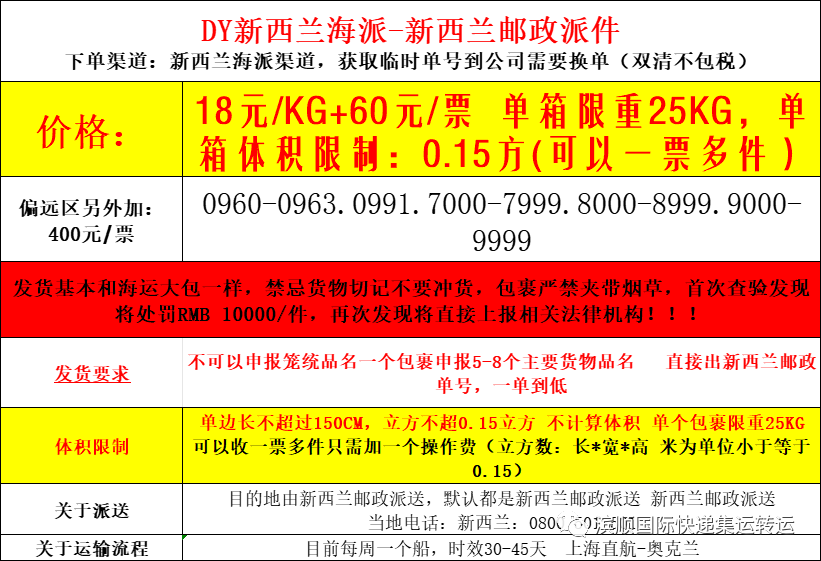 3.新西兰海派,立方不超0.15立方 ,不计算体积,实重计费,安检较松。