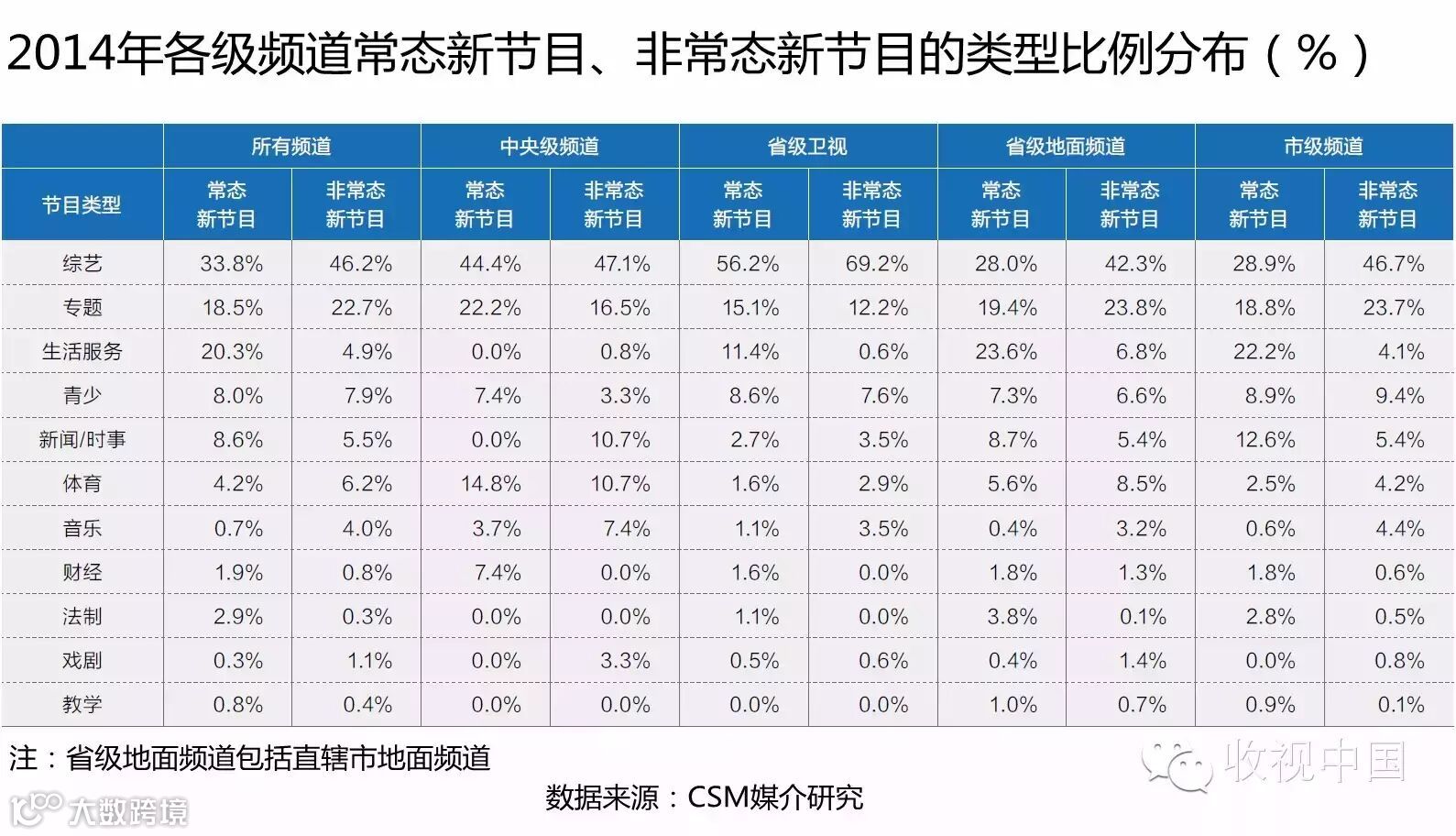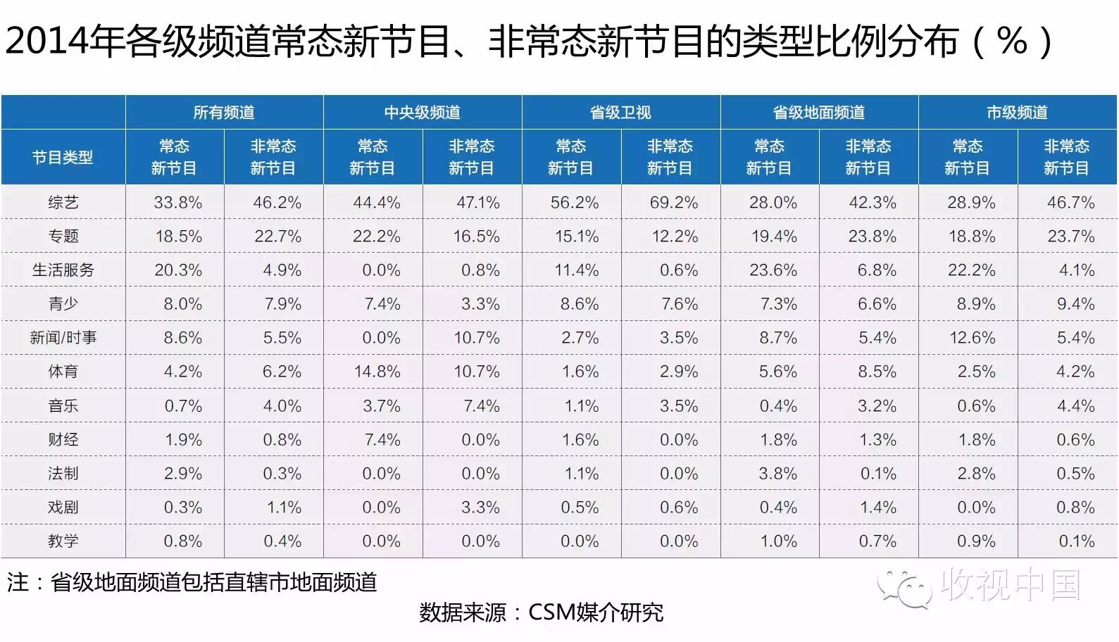 综艺节目在从中央到地方各级媒体的电视节目创新中均占据重要的位置,其中省级卫视对其尤其倚重,常态与非常态新节目中综艺节目占比均超过五成。