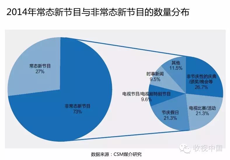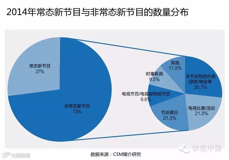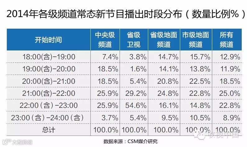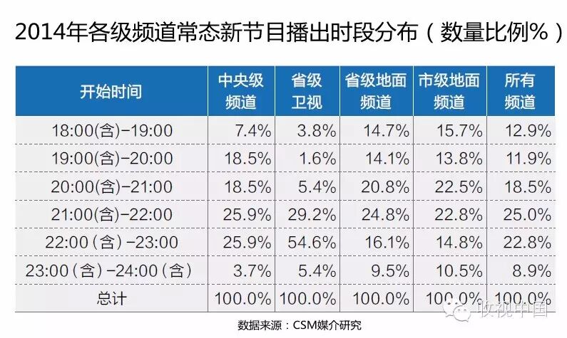 2013年所有频道中开始时间在21:00-23:00之间的常态新节目数量占总体的45.9%,2014年这一数值上升至47.8%。