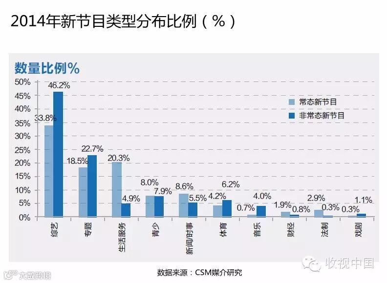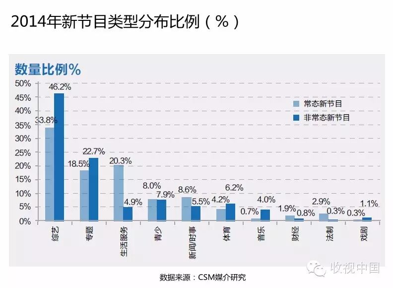 同时,与政策规范下的节目类型发展以及2014年体育及政治事件相关,青少、体育和新闻/时事类新节目的创新也较为活跃。