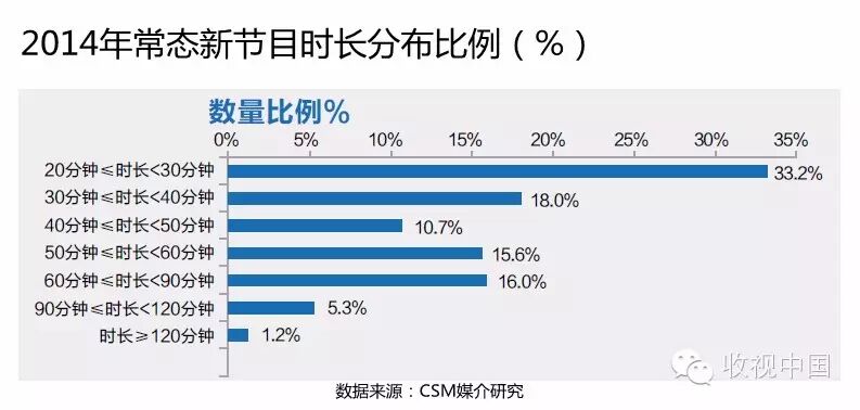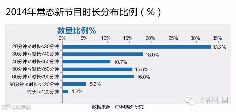 从2014年常态新节目的播出时长来看,逾一半常态新节目的时长在30分钟左右(20-40分钟),其中33.2%的常态新节目时长在20-30分钟之间,18%的节目时长在30-40分钟之间。时长超过90分钟的常态新节目比例不足10%。