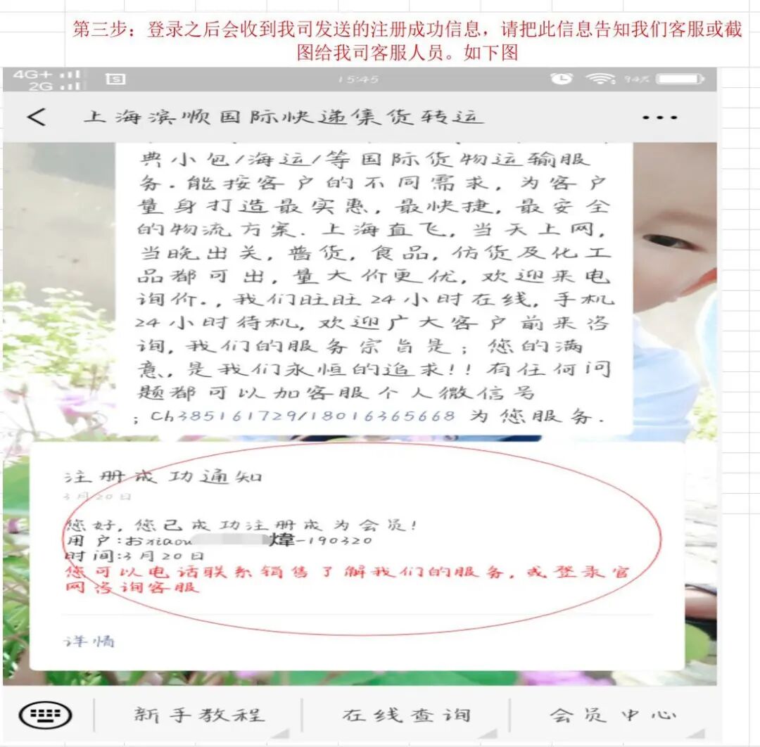 麻烦按以下图片操作后联系我司公众号告知您注册成功的截屏信息,然后我们的客服帮您操作绑定后,您这边后续就可以收到到件提醒了。