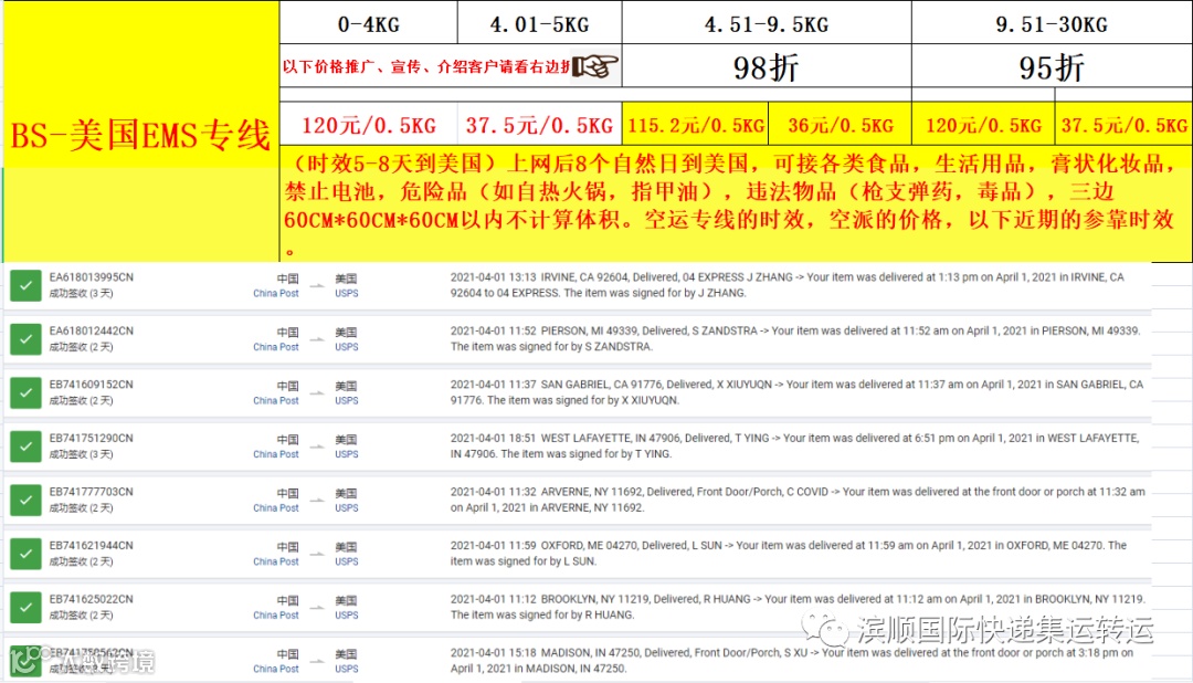 滨顺国际快递集运转运以下价格2021年4月12日开始执行;