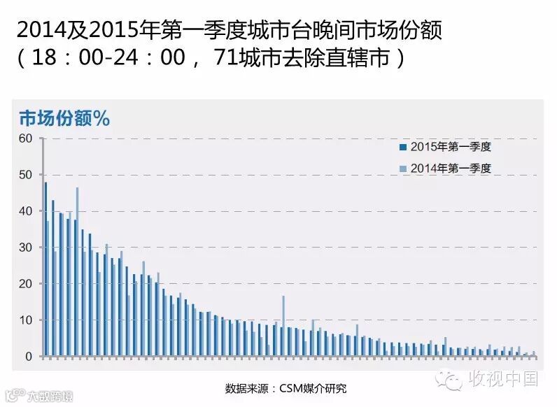 2015年第一季度晚间时段,除去直辖市以外的各城市台排名前二十的城市,平均市场份额为28.2%,比2014年同期提高了1.7个百分点;排名最低的20个城市的城市台份额也比去年同期有了小幅提升。