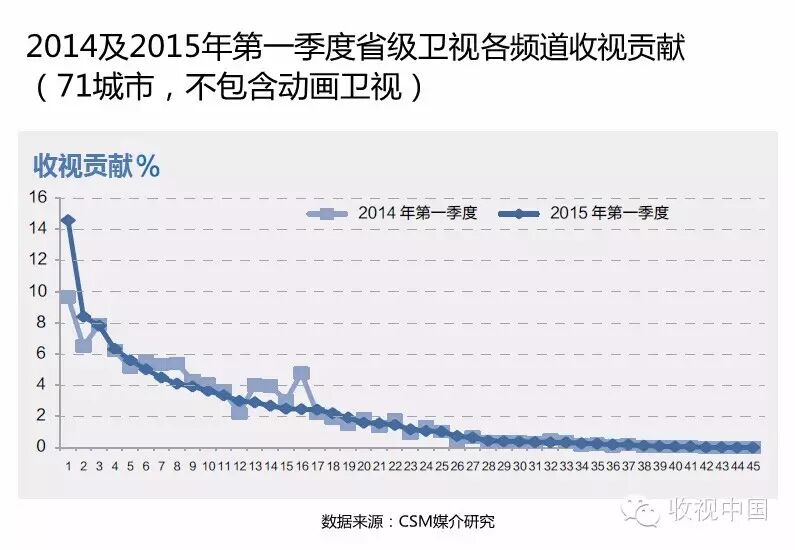 2015年第一季度,省级卫视竞争力呈阶梯状分布,在除去所有动画卫视的45个卫视频道中,排名前三位的卫视累计收视贡献为30.8%,同比增长幅度为28%。