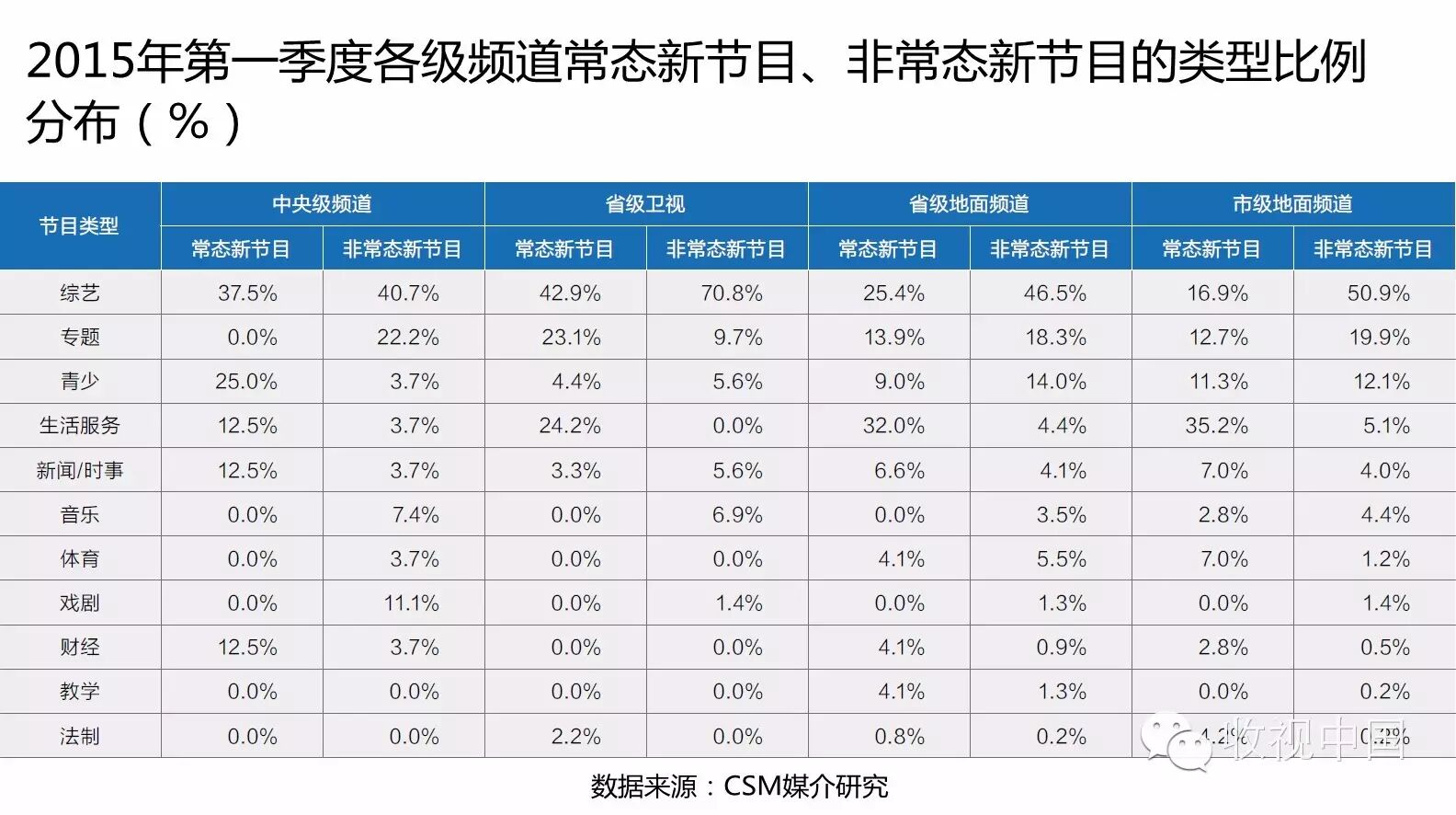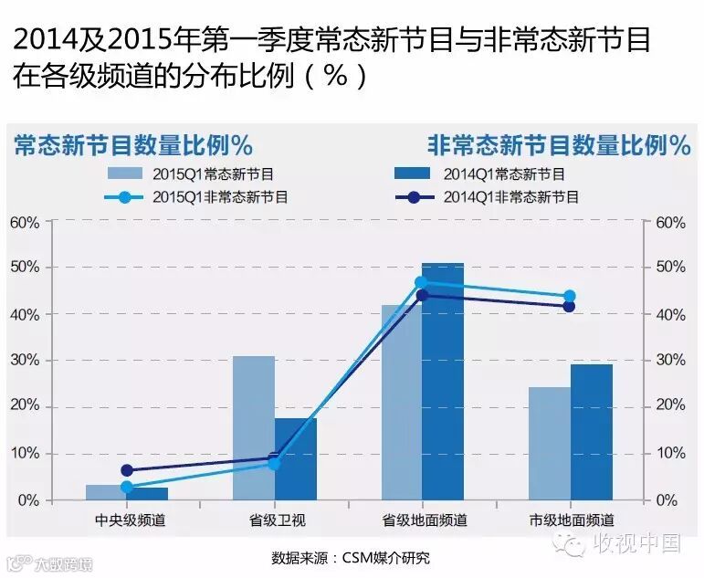 2015年第一季度,在整体市场常态新节目创新步伐放缓、创新量下滑的情况下,各级频道在常态节目的创新上呈现出不同的趋势。
