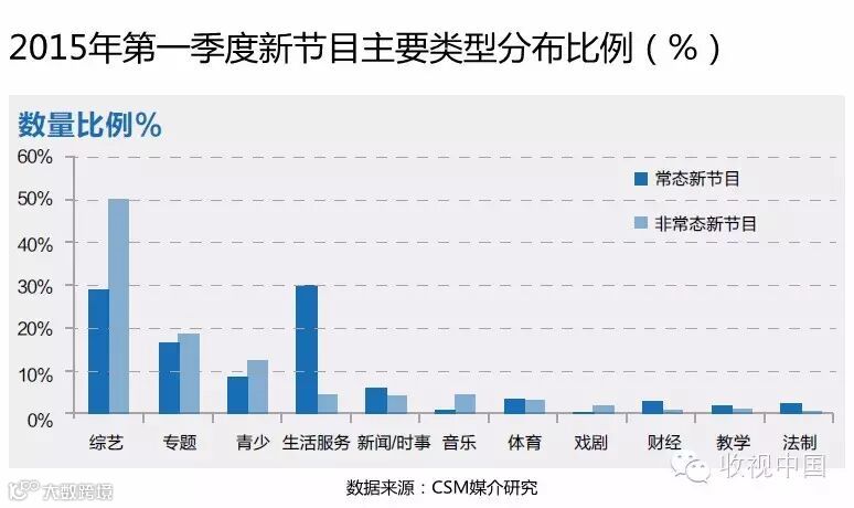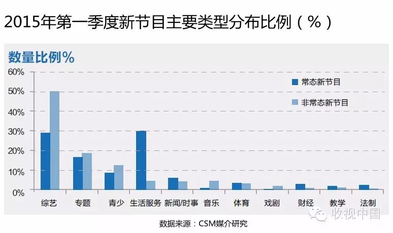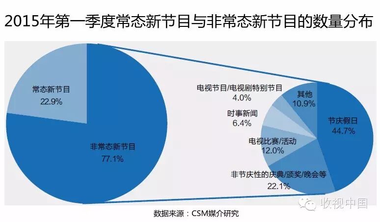 以节庆/假期特别节目、年度人物评选及颁奖、电视活动及相关特别节目、才艺及相关电视比赛为主体的非常态新节目则占到新节目总量的77.1%,较上年同期有所增加。