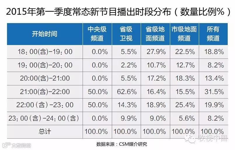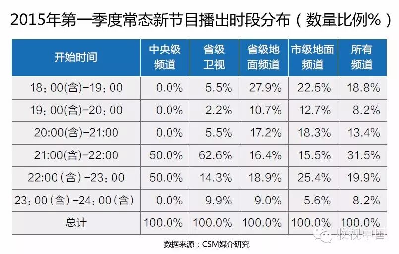 2015年第一季度随着广电新政的实施,“920”时段成为上星频道常态新节目集中发力的时段,中央级频道有一半的节目开播于21:00-22:00时段,省级卫视在这一时段开播的新节目比例更是高达62.6%。