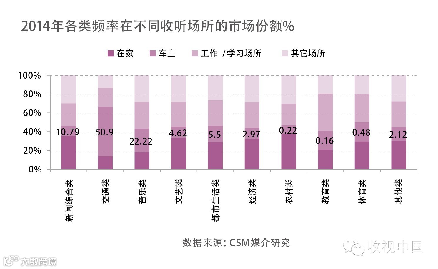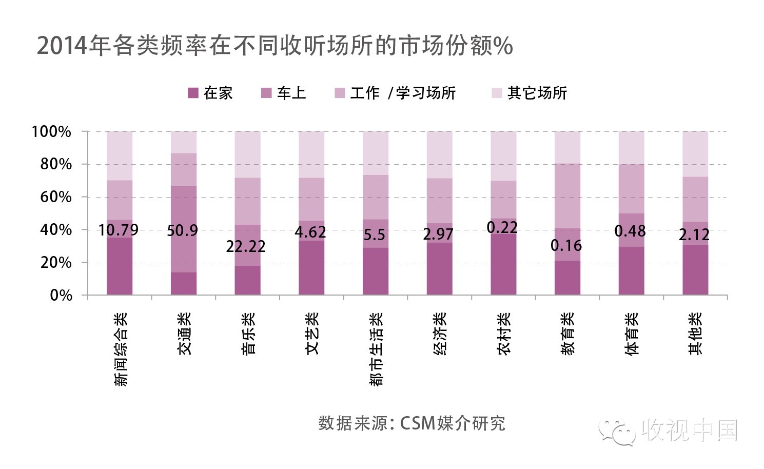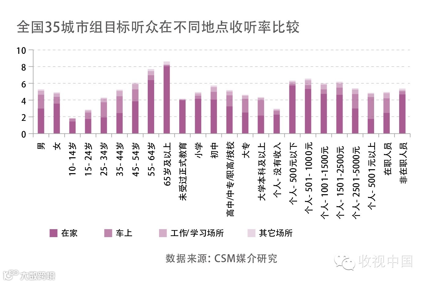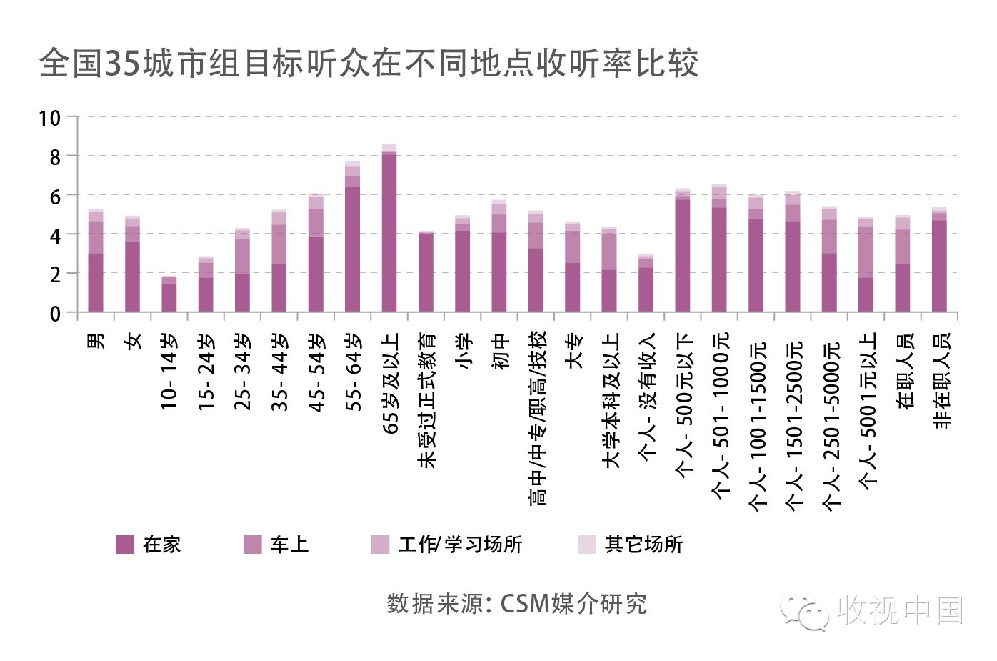 受众的结构分化更加显著。在家户内收听的听众,基本上以中老年、女性、受教育程度低、收入较少的退休人员为主;而车上、工作/学习场所中,则是以男性、中青年、受教育程度高和收入较高的职业人群为主。