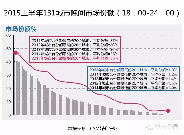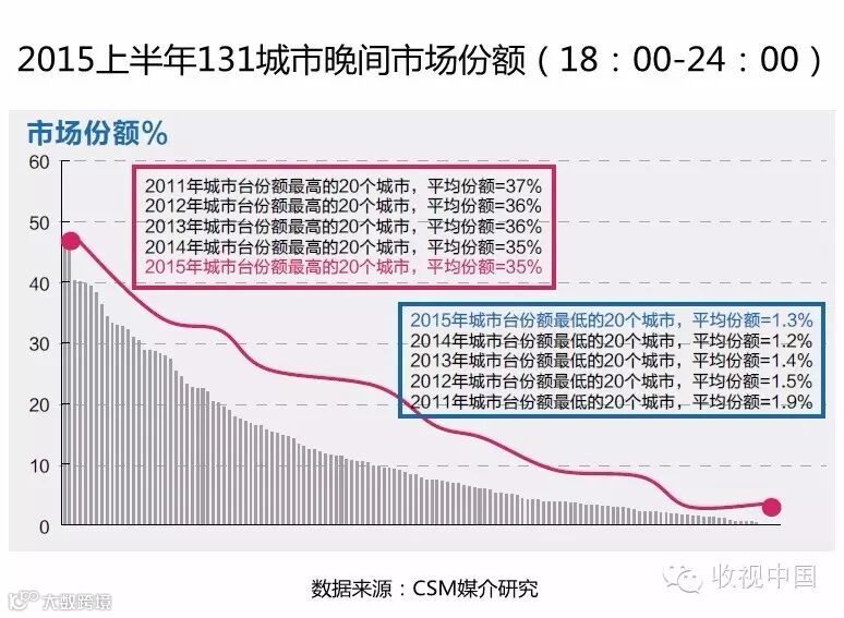 近年来,城市台的市场占有率一直在与其他各级频道的竞争中不断萎缩,2015上半年,受电视新政影响,城市台止跌回稳。