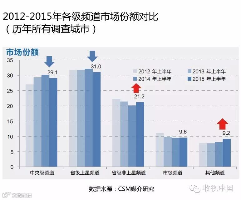 2015年上半年,在CSM媒介研究所有调查城市的电视市场,各级频道电视市场竞争呈现以下特点。