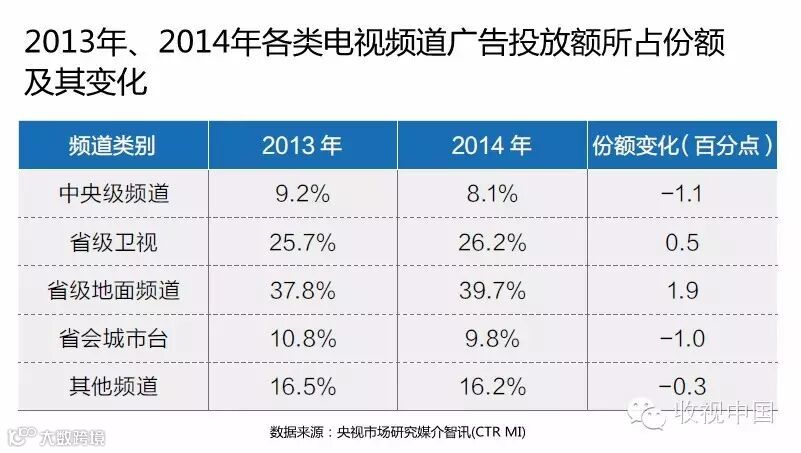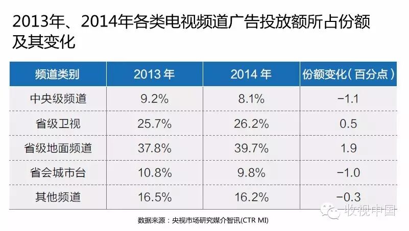 在2014年各类电视频道广告投放的竞争中,中央级频道份额比2013年减少了1.1个百分点。