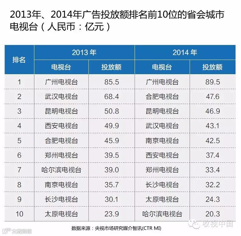 在TOP10中,按刊例价计算,2014年广告投放额上升明显的是广州电视台和南京电视台;而武汉、西安和哈尔滨电视台的广告投放额比2013年有较大幅度下跌。