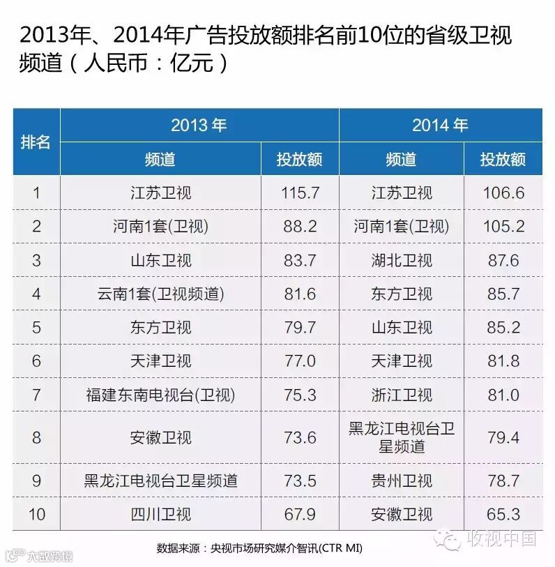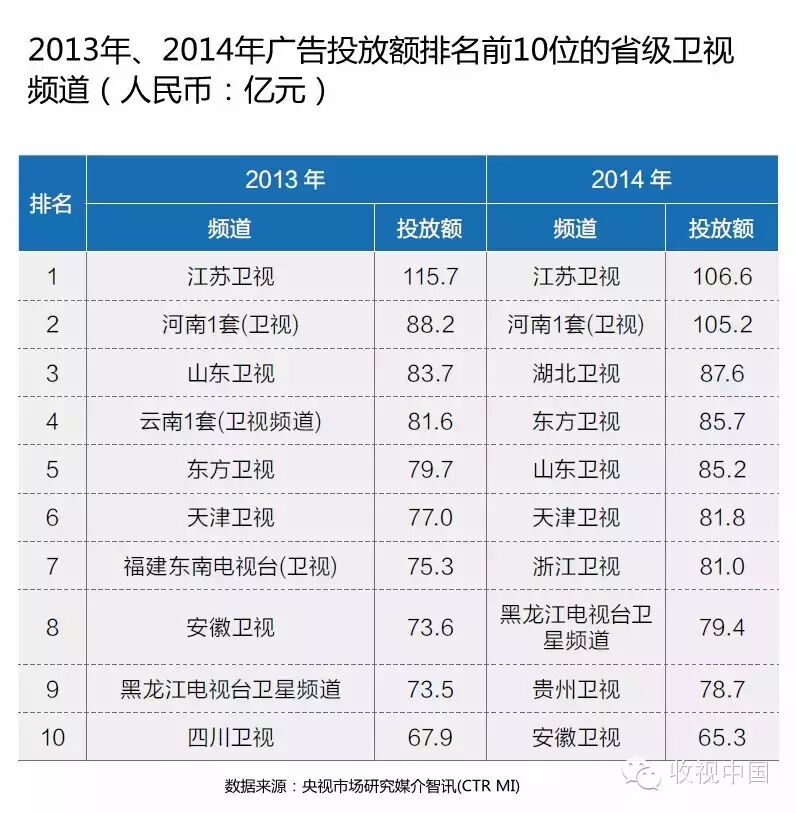 近年来,湖南卫视等几个较为强势的省级卫视拿出黄金资源进行广告招标,本文数据仅基于频道硬广告刊例价计算,不体现实际招标结果及软广告投放,这是湖南卫视等频道未进入2014年TOP10的主要原因。