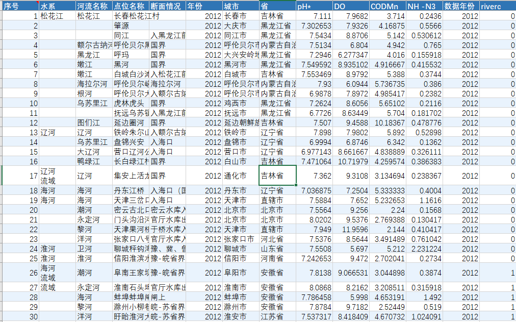 本数据基于国家重大区域发展战略,构建长江经济带标识变量riverc:当监测点所在省份属于长江经济带覆盖范围时,riverc取值为1;其他地区监测点时,riverc取值为0(长江经济带包含11个省市:上海市、江苏省、浙江省、安徽省、江西省、湖北省、湖南省、重庆市、四川省、云南省、贵州省)。本数据覆盖全国31个省级行政区(直辖市、省、自治区)的典型监测断面,时间跨度为2012年至2018年,共计7个年度。数据采集遵循国家《地表水环境质量标准》(GB 3838-2002),选取具有代表性的pH值、溶解氧(DO)、高锰酸盐指数(CODMn)和氨氮(NH3-N)四项核心指标,这些指标能够综合反映水体的酸碱平衡状况、有机污染程度和营养盐水平。