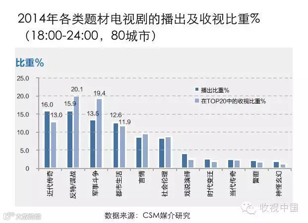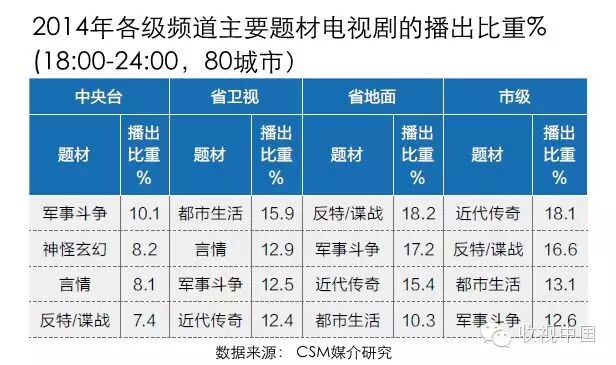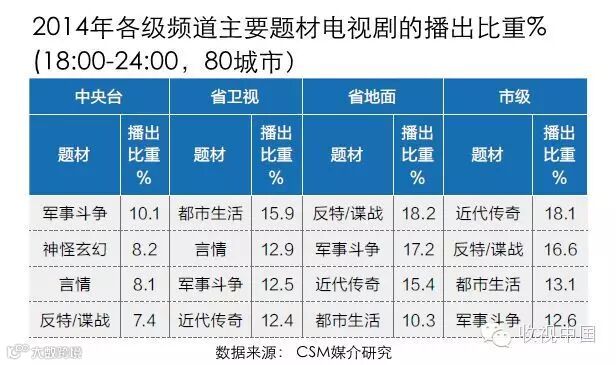 近代传奇剧和反特/谍战剧是2014年电视台播出的最大题材,而军事斗争剧和反特/谍战剧和在2014年的 “TOP20好剧俱乐部”中表现异常突出。该题材的流行反映了情节性较强、戏剧冲突激烈、人物快意恩仇、气质干净利落、情绪酣畅淋漓的“麻辣烫式”的电视剧更契合当今观众的收视心理。