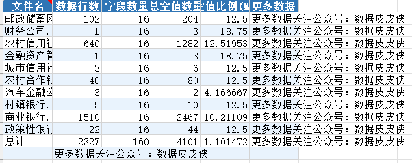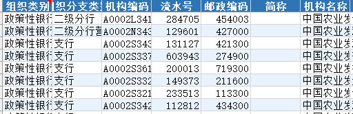 数据格式:数据以 Excel 格式存储,根据金融机构类型分别生成 10 个独立的 Excel 文件,具体包括:邮政储蓄网点.xlsx、财务公司.xlsx、农村信用社.xlsx、金融资产管理公司.xlsx、城市信用社.xlsx、农村合作银行.xlsx、汽车金融公司.xlsx、村镇银行.xlsx、商业银行.xlsx、政策性银行.xlsx;因本次数据量未达到超大量级标准,暂不采用 CSV 格式存储。